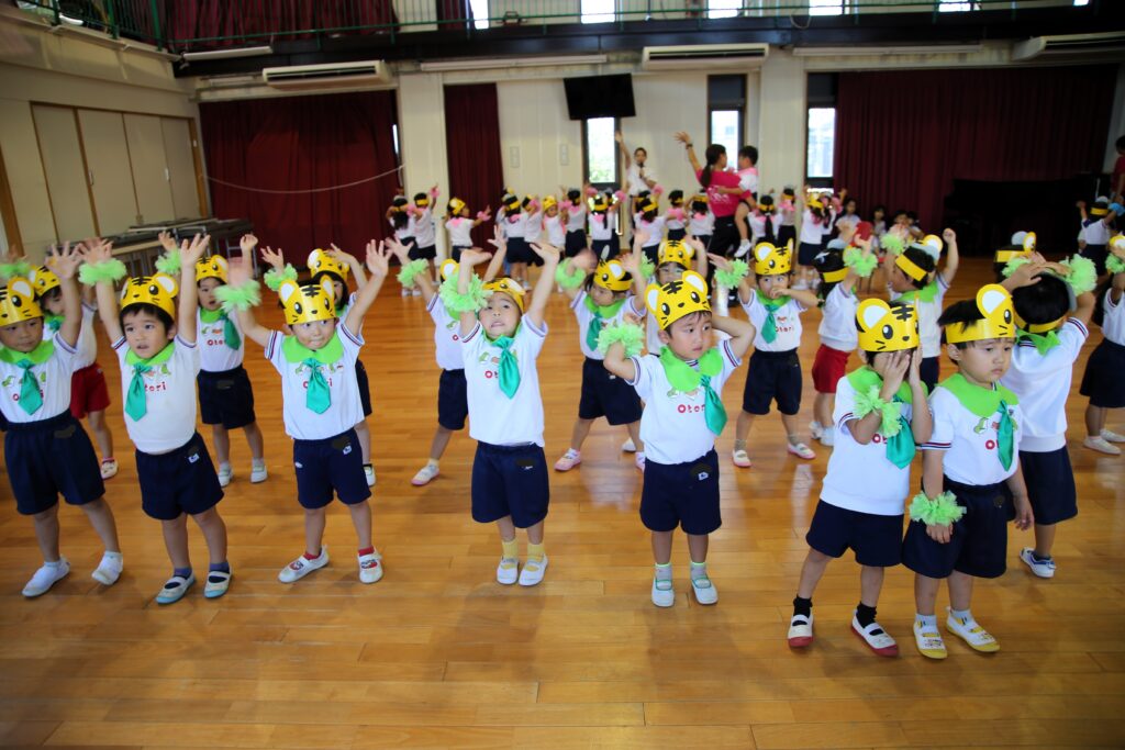 年少組は遊戯室でリズム演技の練習をしました。