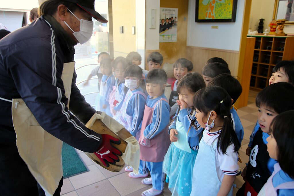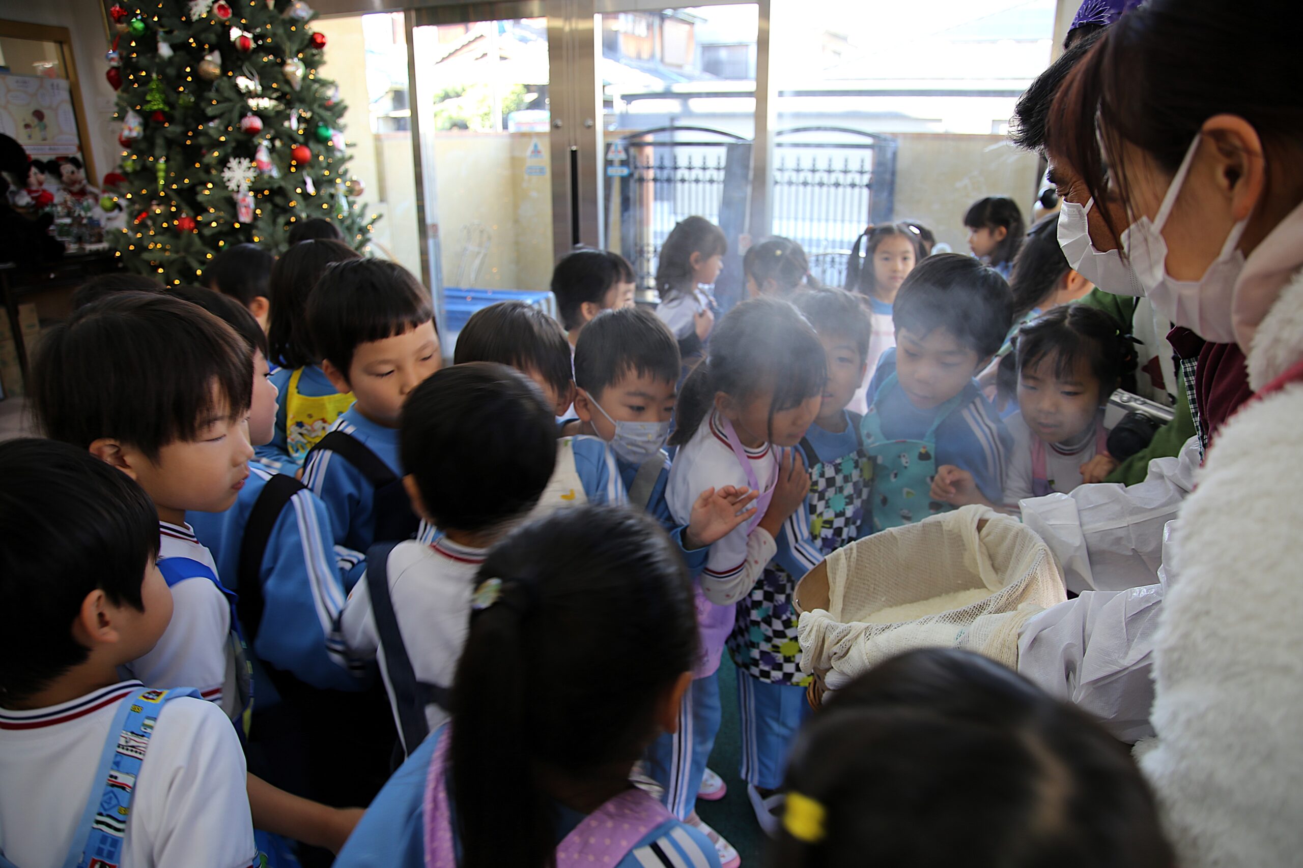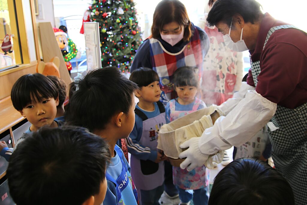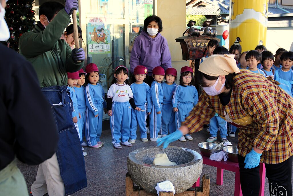 りんご・年少組のお友だちもおもちつきを見学しました。初めて見るおもちつきにびっくりして固まっていました。