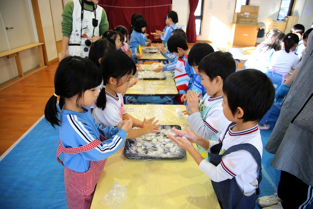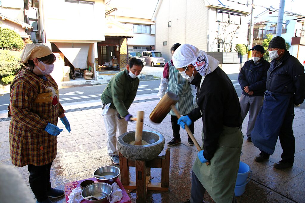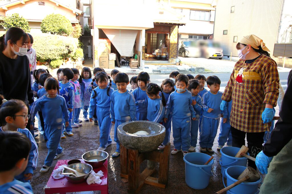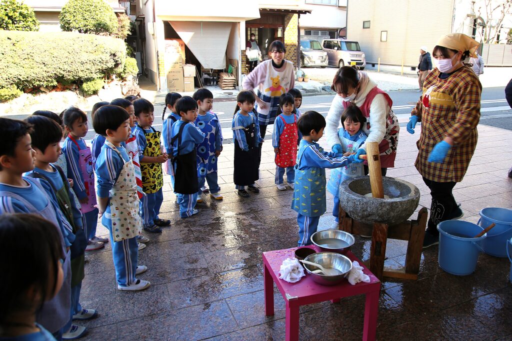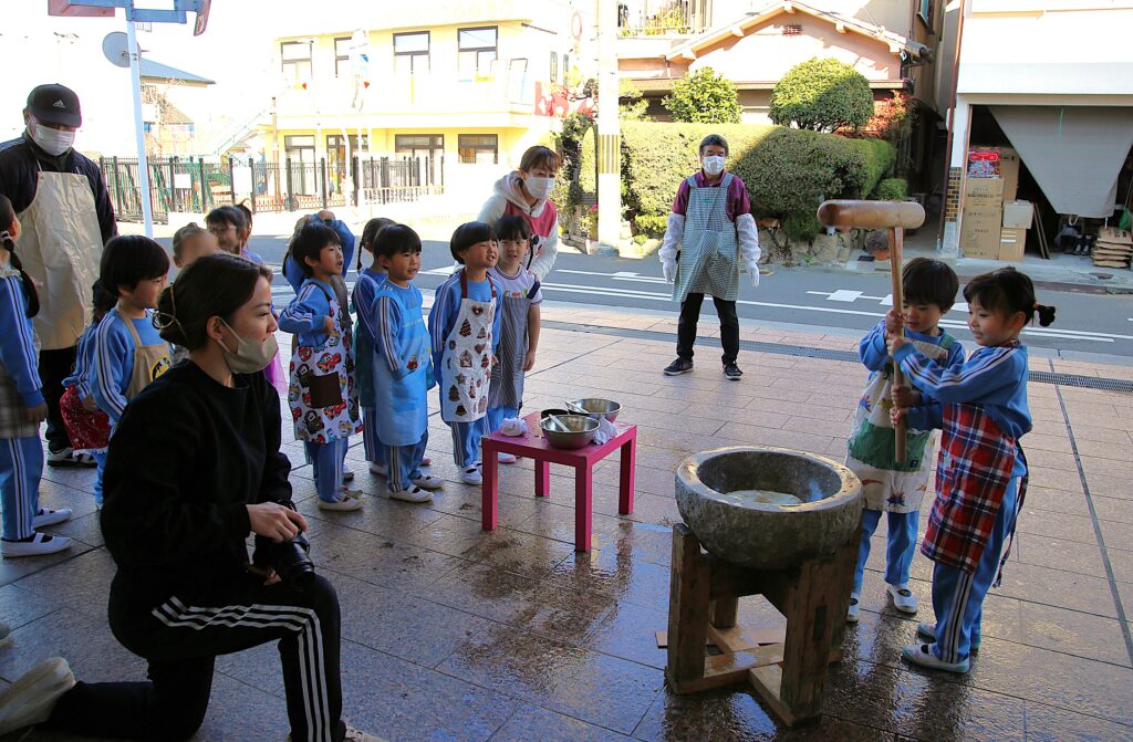 年長組のお友だちは子ども用の杵でぺったんぺったんと頑張ってつきました。