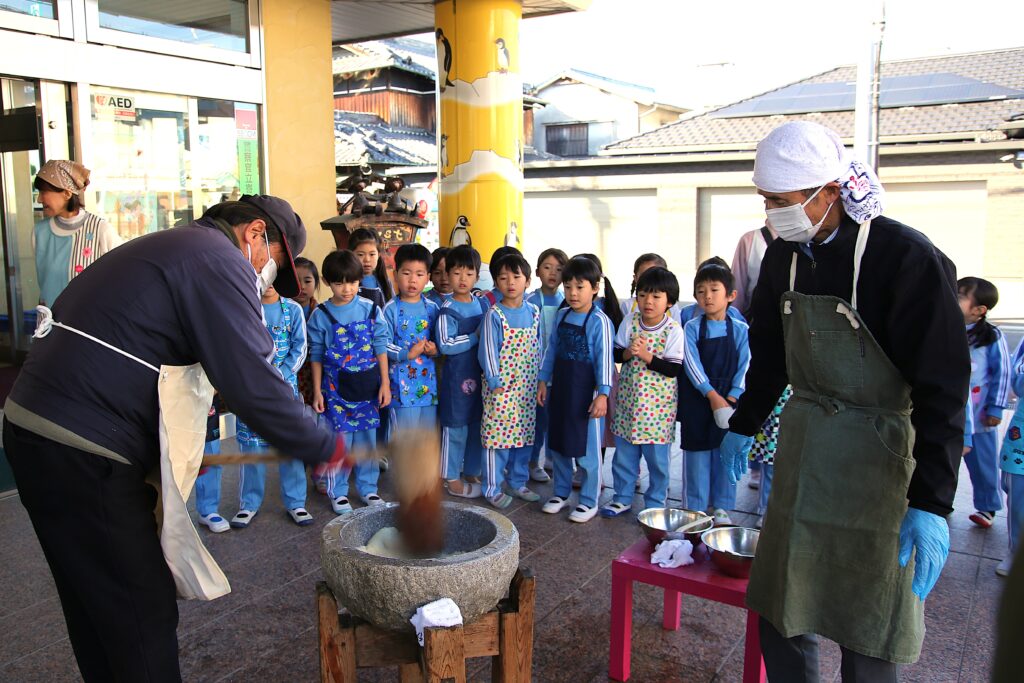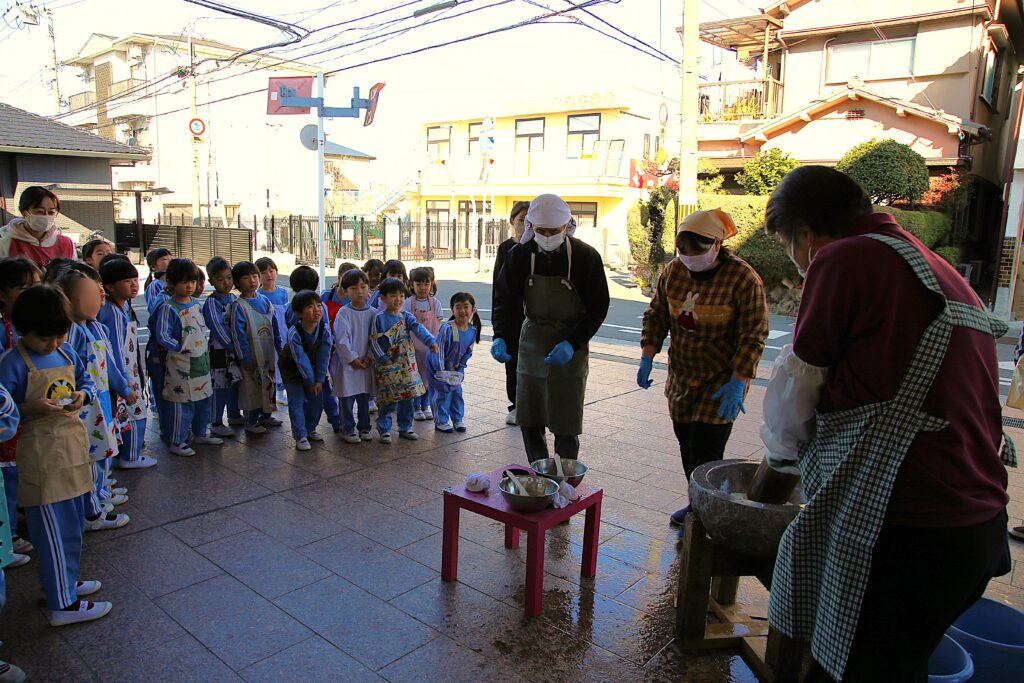 おもちつきを行いました。運転手さんや用務員の方が大きな杵で力強くおもちをついてくれました。