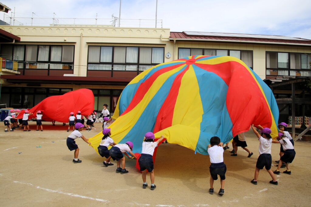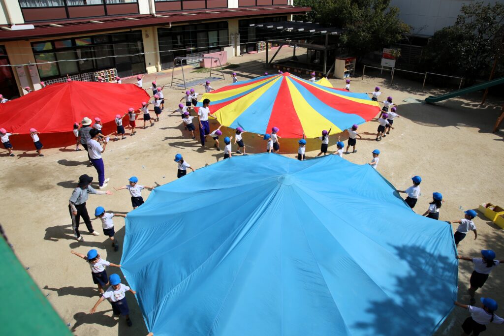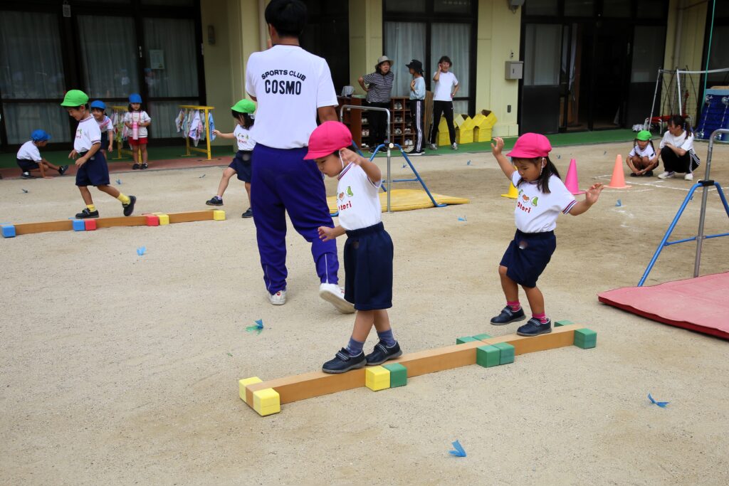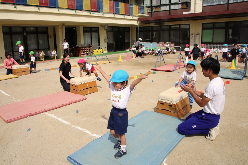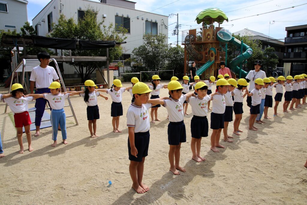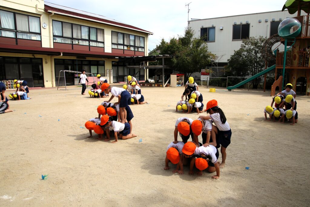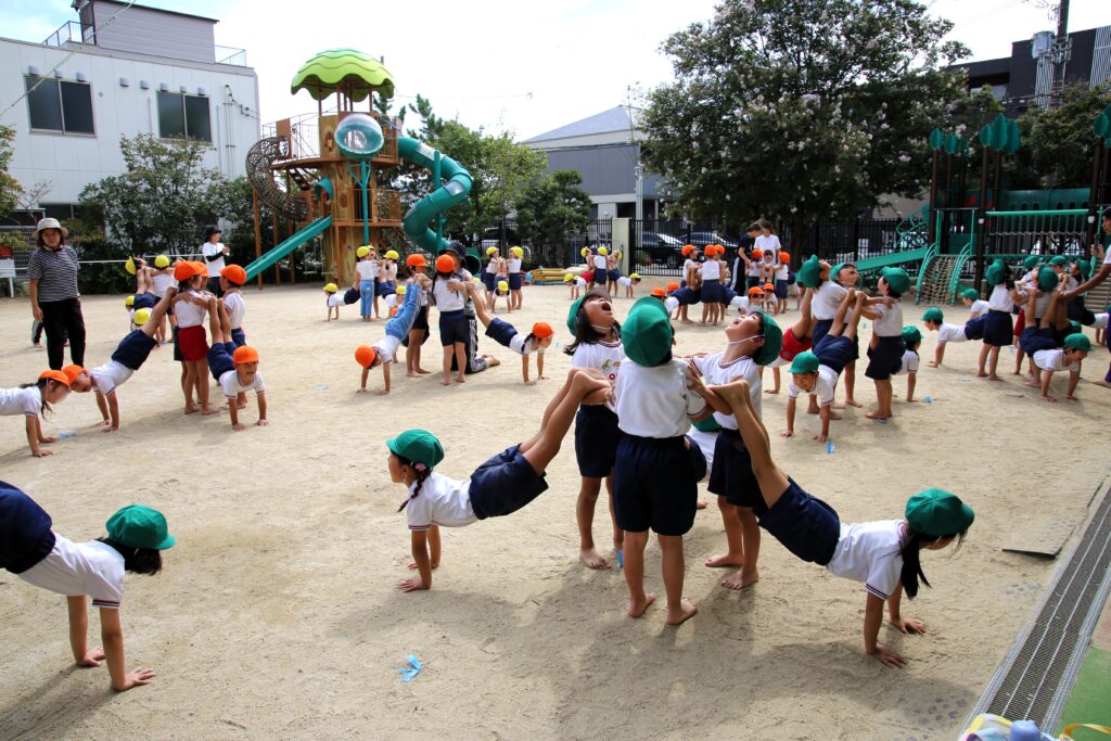 年長組は初めて園庭で行う組体操の練習に「あしのうらいたいんやろ?」と少し不安そう。