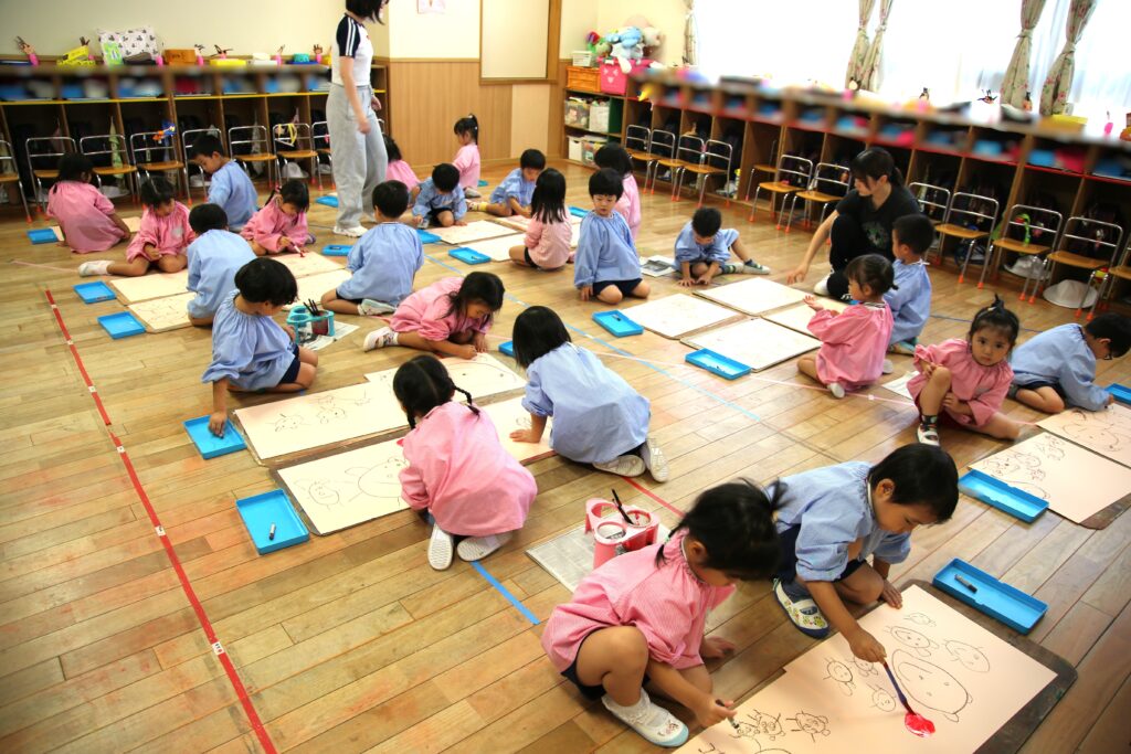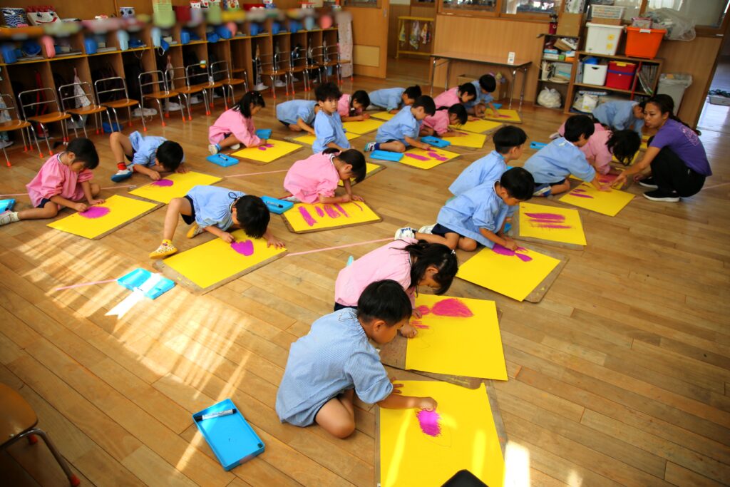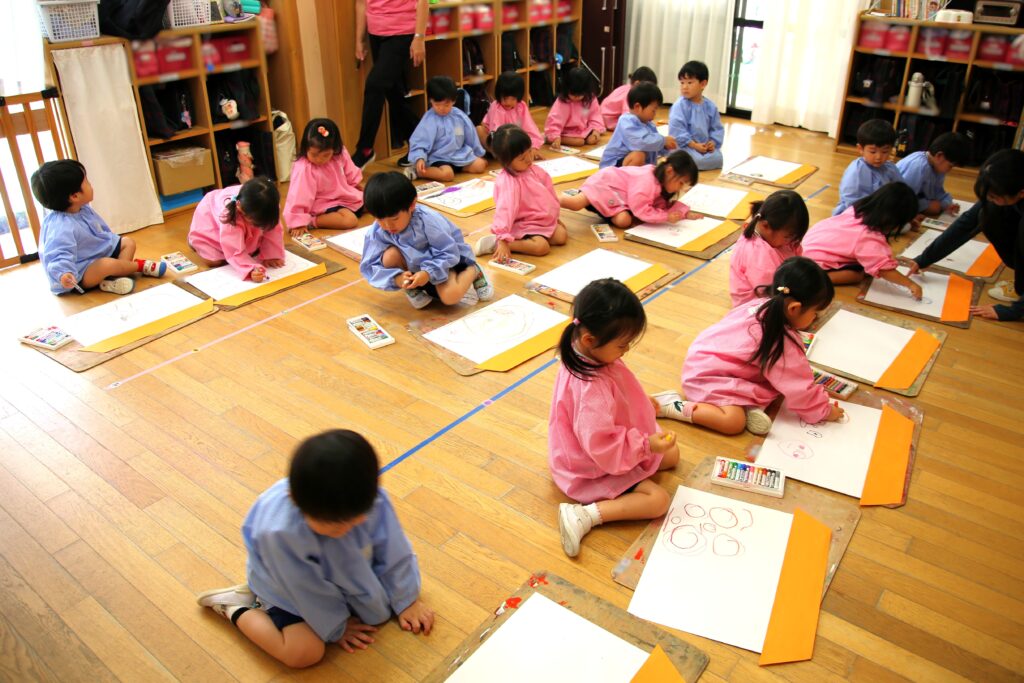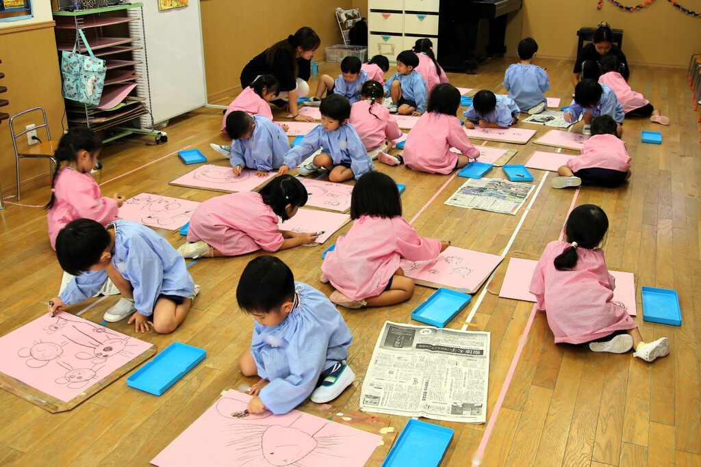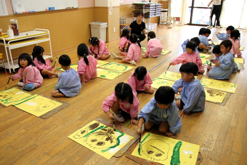 子どもたちが自分で考えた想像の世界を画用紙いっぱいに描いていました。