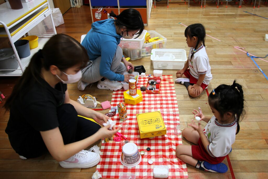 いちご組はいろいろな廃材を組み合わせて人形の顔を制作中です。