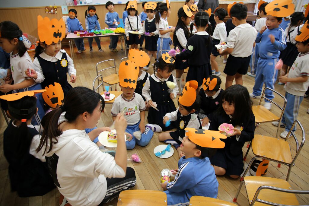 先生が仮装してハロウィンバージョンの英語学習がありました。